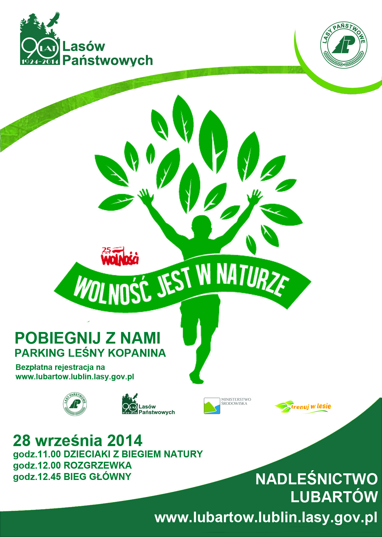 Zgodnie z zapowiedzią, w kompleksie Lasów Kozłowieckich Nadleśnictwa Lubartów utworzyliśmy ścieżkę biegową "Kopanina". Trasa powstała w ramach projektu realizowanego przez Lasy Państwowe we współpracy z Ministrem Środowiska. Nasza ścieżka jest jedną z 25 tras wytyczonych na terenie całego kraju i jedyną tego typu na Lubelszczyźnie. Hasło "Wolność jest w naturze" ma na celu upamiętnienie 25. rocznicy odzyskania wolności w historycznych wyborach 4 czerwca 1989 roku. Zadaniem akcji jest propagowanie aktywnego spędzania czasu na łonie natury. Wystarczy przekroczyć bramy lasu, aby poczuć i zobaczyć jak wiele korzyści daje taki właśnie wypoczynek!